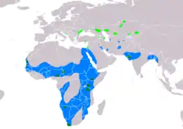 On le trouve du sud-est de l'Europe jusqu'en Asie centrale et au Moyen-Orient, et dans la majeure partie de l'Afrique subsaharienne, dans les marais et les lacs peu profonds. Son nid est simplement constitué d'un amas de branchages au sol ou dans un arbre.