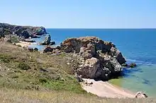 Sur la côte de la péninsule de Kertch se trouve, séparé de la mer Noire par une bande de terre, le lac Koyashskoye.