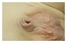 Le pénis a alors un aspect de micropénis, bien que sa taille réelle soit "normale". Cette anomalie est généralement congénitale : le pénis a dans ce cas été enfoui dans les tissus prépubiens, ou enfermé dans le tissu scrotal durant la croissance fœtale, par exemple à la suite d'un échec partiel de la migration postérieure des plis labioscrotaux[19] ; ou à la suite d'une perturbation du développement du prépuce[20] (le gland du pénis est d'abord dépourvu de tout revêtement ectodermique, puis au cours du développement embryonnaire, la couche ectodermique sur la face dorsale du pénis se développe et recouvre finalement tout le pénis. Une anomalie de ce stade de développement peut aboutir à une fusion pénoscrotale (du pénis avec le scrotum)[21]. En Inde, un pénis plus ou moins palmé a été retrouvé chez environ 4 % des bébés (236 cas sur 5881 bébés)[22].
