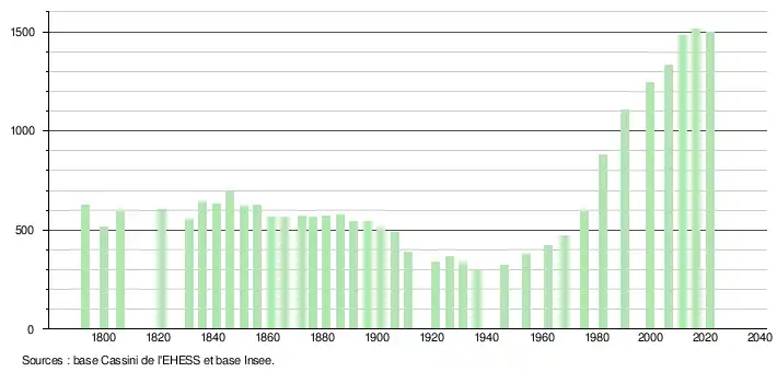 L'évolution du nombre d'habitants est connue à travers les recensements de la population effectués dans la commune depuis 1793. Pour les communes de moins de 10 000 habitants, une enquête de recensement portant sur toute la population est réalisée tous les cinq ans, les populations légales des années intermédiaires étant quant à elles estimées par interpolation ou extrapolation[36]. Pour la commune, le premier recensement exhaustif entrant dans le cadre du nouveau dispositif a été réalisé en 2006[37].