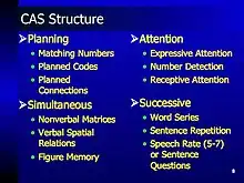 La théorie PASS fournit le cadre théorique d'un instrument de mesure appelé le Das–Naglieri cognitive assessment system (CAS) (en), publié en 1997[5]. Ce test est conçu pour fournir une évaluation nuancée du fonctionnement intellectuel, fournissant des informations sur les points forts et les points faibles de chacun des quatre processus cognitifs. Cet accent mis sur les processus cognitifs est utile dans le cadre d'un diagnostic différentiel. Le CAS aide au diagnostic des troubles d'apprentissage, des troubles de l'attention (ADD), de l'autisme, du retard mental, des modifications cognitives dues au vieillissement ou au syndrome de Down, et, aux changements cognitifs résultant d'un accident vasculaire cérébral[6]. Son utilité en tant que théorie et instrument de mesure pour la planification et la prise de décision en management a également été suggérée.[réf. nécessaire]