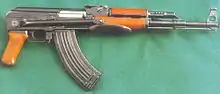 Un PMK ou Kbk-AK: l'AK-47 fabriquée par l'Arsenal de Radom pour l'Armée populaire polonaise. L'adhésif rouge indique que l'arme est rendue inerte pour l'entraînement des recrues.