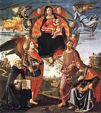 Le panneau principal était dédié à la titulaire de l'église, qui était suspendue dans un halo lumineux entouré de séraphins et d'angelots, tout en tenant l'Enfant qui découvre son sein à allaiter. Deux autres anges symétriques s'envolent en remplissant l'espace supérieur. En dessous se trouvent quatre saints : saint Dominique, fondateur de l'ordre, qui tient un livre ouvert à la main et indique la règle des frères, saint Michel, saint Jean le Baptiste, l'autre titulaire de la chapelle, et saint Jean. En arrière-plan court un paysage de goût flamand, avec deux éperons rocheux sur les côtés qui servent de décor théâtral et un paysage s'ouvrant au centre qui, avec une ville à tourelles de saveur nordique, se perd au loin entre des collines ombrées de couleur bleu et d'arbres feuillus. L'exemple de l'école ombrienne est évident, en particulier du Pérugin qui était le propriétaire d'un atelier très populaire à Florence.
