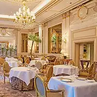 Avant que ne soit lancée la bataille de gastronomie parmi les palaces parisiens, le restaurant Les Ambassadeurs de l'hôtel de Crillon resta un symbole de l'hôtellerie française de luxe. Tout en conservant le décor original datant du règne de Louis XV[13], cette ancienne salle de bal du duc de Crillon possédait deux macarons du Guide Michelin[14] et était adhérent aux Relais & Châteaux[N 1]. Il s'agissait donc de l'un des restaurants les plus prestigieux en France. Il était en effet, avant sa vente à Starwood Capital Group en 2005, propriété de Taittinger, l'une de grandes maisons de champagne. En faveur de la maison de Reims, il était capable de distinguer l'Hôtel de Crillon d'autres établissements. Très connu dans le monde entier, car entre 1992 et 2012, celui-ci accueillit chaque année vingt-cinq jeunes filles du gotha international lors du Bal des débutantes. Ce bal était suivi d'un dîner exceptionnel, tout comme lors de la présentation de plusieurs prix littéraires.