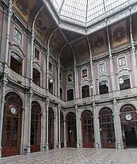 Vers 1880, elle sera couverte d'une imposante verrière octogonale, œuvre de l'architecte Tomás Soler[6] : la verrière repose sur une charpente métallique[7] déportée vers l'intérieur, soutenue par une série de piliers que l'on peut voir entre les ouvertures. Ce procédé avait l'avantage de conserver l'altérité du bâtiment primitif. Les remplis sont décorés avec armoiries civiles des 25 nations avec lesquelles le Portugal entretenait d'étroites relations commerciales et culturelles. Aux quatre coins, des cartouches rappellent les dates importantes de l'histoire de l'ACP. Au centre de l'imposte de la porte fenêtre conduisant au grand escalier, se trouve une horloge donnant l'heure, à gauche un baromètre portant des indications utiles à la navigation vers l'Alto-Douro. (L'autre moitié des façades sur la cour est en cours de restauration.)