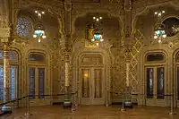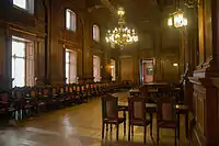 La salle dorée, de style empire avait plusieurs usages, administration, transactions sous seing privé, arbitrages amiables... Relativement austère, elle doit son nom au plafond en stuc richement décoré de motifs végétaux recouverts de feuilles d'or.