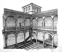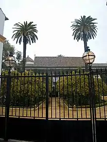 Le bâtiment principal, la salle à manger d'été et d'autres édifices entourent les autres côtés du patio. On accède à l'étage du bâtiment principal par un grand escalier formé de deux volées de marches, couvert d'un plafond à caissons de style mudéjar. L'escalier mène aux grandes pièces du palais, dont une salle de réception, le salon d'honneur et la salle à manger d'hiver[9]. Une salle de bain du premier étage possède un alfarje (es) (plafond en bois taillé et entrelacé artistiquement) doré, de forme octogonale, soutenu par un arrocabe, un ensemble de boiserie assemblant les murs entre eux et soutenant le plafond[4],[5].