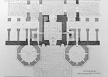 En arrière du porche monumental d'entrée constituant le côté sud du Péristyle se trouve le Vestibule[32], une grande chambre circulaire (rotonde) de 12 m de diamètre et 17 m de hauteur. Ses murs ne présentent pas un appareil de parpaings dressés mais une maçonnerie alternant les assises de moellons et de mortier et celles de briques (opus incertum mixtum). Quatre niches semi-circulaires ouvrent de part et d'autre des entrées nord et sud de la pièce, qui était éclairée à l'origine par de petites fenêtres hautes. Le plafond est une voûte qui, comme les murs, devait être recouvert d'une mosaïque de verre coloré. La rotonde du Vestibule est inscrite dans un édifice carré, de telle sorte que les murs étaient suffisamment épais dans les angles pour permettre l'aménagement d'escaliers en spirale menant aux niveaux supérieur et inférieur. Le niveau en sous-sol du Vestibule était pourvu d'accès sur ses quatre côtés, vers les thermes est et ouest, le Péristyle et les sous-sols des appartements.