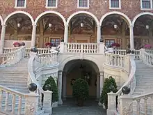 - la cour d'Honneur recouverte d'un mélange géométrique de galets et dalles de pierre et son escalier[alpha 3] du XVIIe siècle, ainsi que les somptueuses fresques d'artistes génois du XVIe siècle[9].