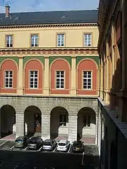 À la différence des façades extérieures, les soubassements en pierre de la cour intérieure comportent des portiques. En outre, les pilastres du niveau supérieur ne concernent que le 1er étage, le 2e étage en étant dépourvus. Les fenêtres du 1er étage sont surmontées d'arcades, lesquelles présentent des touches de couleur verte sur leur partie supérieure.