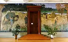 La première salle de l’étage sur laquelle débouche l’escalier d'honneur est le vestibule, aussi appelé la salle des pas perdus. Cette pièce comprend depuis 1939 une large fresque recouvrant l'ensemble de l'un de ses murs. Cette fresque est peinte par l'artiste parisien Pierre Eugène Montézin sur les thèmes « Le travail et la paix » et « La justice et le droit »[8], thèmes inscrits au bas de la fresque. Elle représente notamment des scènes de fenaison dans les champs et encadre la porte d'entrée principale à la salle des séances solennelles.