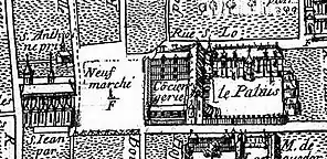 Le , les conseillers de la ville adoptent une résolution en vue de construire au Neuf Marché une grande salle, dénommée aujourd'hui Salle des Procureurs[3], où les marchands de la ville pourront se réunir[6]. Première étape de la construction de l'actuel palais de justice, cet édifice, correspondant actuellement au corps de bâtiment ouest[2], est construit entre 1499 et 1508 par les architectes Roger Ango et Roulland Le Roux.