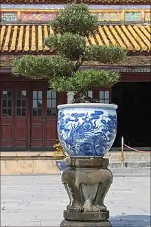 Le palais contient des jarres et des objets antiques. On remarque de nombreuses poteries[4] de porcelaine bleue (le fameux bleu de Hué) que l'empereur commandait spécialement en Chine.