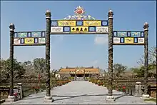 Devant le palais, s’étend la Cour Dai Triêu Nghi (esplanade des Grandes salutations) dallée de granit Thanh et dont les deux niveaux supérieurs étaient réservés aux mandarins civils et militaires de haut rang. De chaque côté de la cour, il y a deux rangs de petites stèles appelées Pham Son, indiquant la place attribuée aux mandarins.