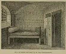 La première cellule de Marie-Antoinette d'Autriche fut installée dans l’ancienne chambre de réunion des guichetiers (une cellule humide composée d’un lit de sangle avec deux matelas, d’un fauteuil en canne, de deux chaises et d’une table) donnant sur la cour des femmes par une étroite fenêtre. Après une tentative d’évasion (voir Alexandre Gonsse de Rougeville), Marie-Antoinette fut transférée dans la deuxième cellule. La reconstitution de la cellule de la reine a été faite pour une moitié sur l’authentique cellule et pour l’autre moitié sur la travée contiguë à l’est. Elle fut gardée par Madame Larivière qui montra trop de compassion envers la reine et fut remplacée par la citoyenne Harel qui, en tant qu'épouse d'un membre de la police secrète, était là à titre d'espionne[59].