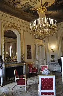 En face de la cheminée se trouvent les portraits du prince et de la princesse de Salm-Kyrbourg qui firent ériger l'hôtel primitif. Entre deux, une console à l'égyptienne fin XVIIIe siècle. Les sièges et les fauteuils sont de Pierre-Antoine Bellangé. De chaque côté de la porte ouvrant sur la salle à manger, une console avec un vase Médicis de Pierre-Philippe Thomire[12].