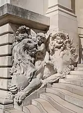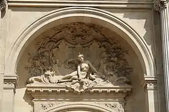 Détail des statues et sculptures de la façade du bâtiment :