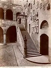 L'escalier de la cour date de 1367, attribuable aux interventions réalisées sous la direction de Neri di Fioravante, qui est couvert d'un auvent jusqu'au XIXe siècle[2].