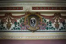 Le décor du salon de l'impératrice, d'esprit rococo, se démarque résolument de l'inspiration Renaissance qui a présidé à la décoration intérieure. Le plafond peint, les portes blanches rechampies surmontées de panneaux peints et la cheminée en marbre blanc confèrent à l'ensemble une atmosphère chaleureuse et gaie qui contraste avec les autres pièces du palais. Les murs tendus de soie bleu pâle devaient renforcer l'impression d'écrin.