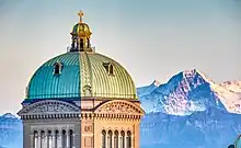 Le Palais fédéral est à la fois le siège du Conseil fédéral (gouvernement) et de l'Assemblée fédérale (parlement) suisse (Conseil national et Conseil des États). Il domine la Place fédérale de Berne, en Suisse.