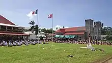 La fête de l'Assomption devant le palais avec les deux drapeaux, celui de la France et celui de Wallis-et-Futuna.