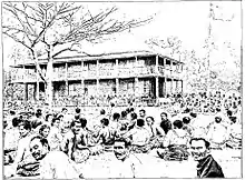 Le palais décoré de guirlandes lors d'un katoaga. La chefferie est assise en dessous au fond de l'image.