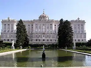 Tiepolo réalise en 1764 La Grandeur et le Pouvoir de la monarchie espagnole, pour le plafond de la salle du trône des appartements de Charles III[6]. Deux esquisses pour cette fresque sont conservées dans des musées : l'Apothéose de la monarchie espagnole au Metropolitan Museum of Art de New York[7] et Richesse et bienfaits de la monarchie espagnole sous Charles III, à la National Gallery of Art de Washington[8].