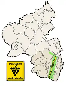 La route du vin allemande (Deutsche Weinstraße) présente la vignoble de Palatinat, longue d'environ 85 kilomètres, commence à Schweigen près de la frontière alsacienne à Wissembourg et se termine à Bockenheim an der Weinstraße.