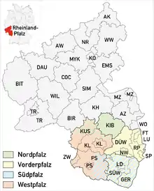 Les arrondissements et les villes-arrondissements, dénommés ci-dessus, sont associés comme le district du Palatinat, une collectivité territoriale fondée en 1852. Son chef-lieu est Kaiserslautern.