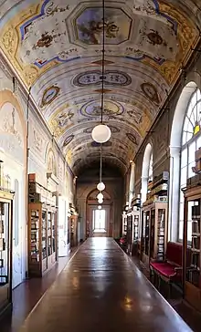 À l'étage supérieur, en correspondance avec chacune des sept arches du portique, ouvrent sept fenêtres à tympan, encadrées de pilastres. Certaines pièces du premier étage ont des fresques avec des sujets mythologiques, comme la Sala Pompeiana (fresque de Giuseppe Sorbolini de 1789), la Sala delle Feste (décorée par Luigi Mulinelli), la Sala di Flora, la Sala di Bacchus et la Galleria (décorée par Giuseppe Castagnoli pour les scènes et par Gaetano Gucci pour les ornements). Dans la galerie, aujourd'hui l'Aula magna, il y a des statues en plâtre à l'imitation du bronze, représentant des Bacchantes et œuvre de Luigi Acquisti.
