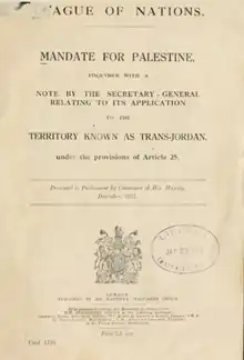 Le , le Conseil de la Société des Nations vote une résolution agréant la proposition de la part du Royaume-Uni d’exclure la Transjordanie (qui sera le futur royaume hachémite de Transjordanie, créé en mai 1946) de l’ensemble du territoire du mandat[9], et le mandat définitif entre en vigueur le [10]. Ses termes exacts et sa délimitation ont été l’objet de tractations entre Britanniques, Français et habitants de Palestine (de toute religion) dans le contexte des différents accords et promesses passés entre eux. Le mandat a pour objectif la mise en place en Palestine d’un « foyer national pour le peuple juif sur la base du lien historique existant entre le peuple juif avec la Palestine dans le but de reconstruire leur foyer national dans ce pays[11], étant clairement entendu que rien ne sera fait qui puisse porter atteinte aux droits civiques et religieux des collectivités non juives existantes en Palestine », tel que défini par la déclaration Balfour du 2 novembre 1917 et repris dans les dispositions du mandat.