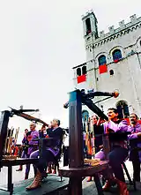 - Le tournoi est clôturé par la remise du trophée (palio) et par un défilé de figurants (en habits d’époque médiévale) qui finissent par s'éparpiller dans les rues de la ville.