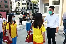 Après une évaluation des stocks nationaux ainsi que la productivité de ses usines de fabrication, la présidente Tsai Ing-wen annonce ainsi un premier don d'un surplus de dix millions de masques, principalement vers les zones particulièrement touchées par l'épidémie, comme l'Espagne, l'Italie, le Royaume-Uni, la Suisse ou encore les États-Unis[105],[106]. La distribution nationale des masques fait par ailleurs l'objet d'une nouvelle régulation à partir du . Les adultes ont à présent accès à un nombre de neuf masques pour 14 jours sur présentation de leur carte d'assurance contre trois par semaine auparavant, tandis que les enfants conservent leur quota de dix masques pour 14 jours[107]. Cette mesure fait suite à l'obligation de porter un masque dans les transports en commun à compter du , sous peine d'une amende d'un montant entre 3 000 et 15 000 NT$ (environ 500 dollars), les usages de distanciation physique étant difficiles à mettre en place dans un bus ou une rame de métro ; les usagers de la ligne ferroviaire à grande vitesse ne portant pas de masque sont quant à eux redirigés vers le point de vente le plus proche[108].
