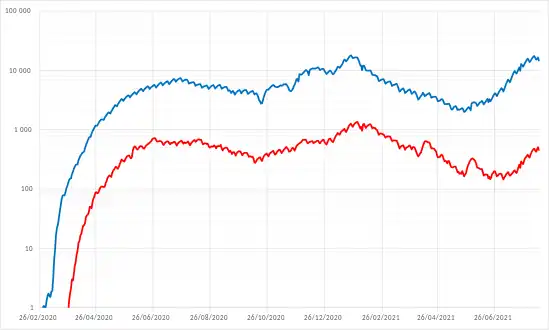 Le lundi , 18 États passent en situation dite de "feu rouge" (semáforo rojo)[179]. Si officiellement ils ne retournent pas en quarantaine, seuls les commerces essentiels - principalement ceux liés à la nourriture, l'hygiène et l'énergie - les établissements médicaux et les administrations régaliennes sont autorisés à rester ouverts, ce qui reproduit de fait la plupart des conditions de la quarantaine du début de la pandémie[180]. Les 14 autres États passent en "feu orange" (semáforo naranja), ce qui signifie que d'autres lieux sont autorisés à rester ouverts, mais les établissements hôteliers et de sport ne peuvent accueillir du public qu'à 50% de leurs capacités habituelles, et les établissements culturels qu'à 25%[181]. Cette situation doit être réexaminée et actualisée le [179].
