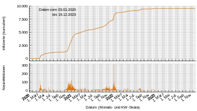 En décembre 398 nouveaux cas portent le nombre de cas à 7 405 dont 275 décès[26].