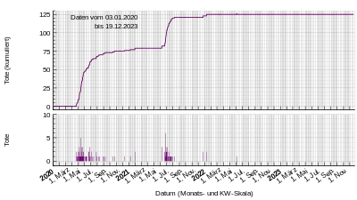 Le premier décès est intervenu le 23 avril 2020, le dixième le 5 mai 2020, et le 100ème le 30 juin 2021[4].