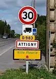 Panneau d'entrée d'agglomération avec panneau B14 à 30 km/h placé sur le même support
