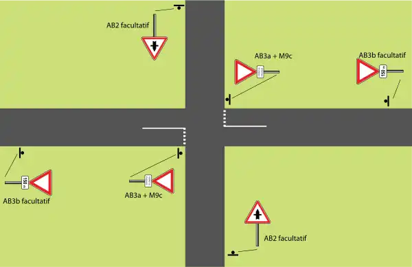 La mise en place du panneau AB3a est subordonnée à l'octroi de la priorité à la route rencontrée[4].