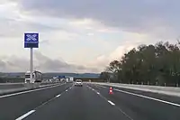 | D74b | Présignalisation complémentaire de bifurcation autoroutière, sans numéro d'autoroute | 2 | Bleu | Supérieur : symbole SE3 Inférieur : distance de la bifurcation. |