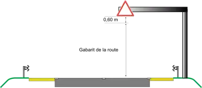 Lorsque les panneaux sont sur portique, potence ou haut-mât au-dessus de la chaussée, ils sont fixés à une hauteur minimale correspondant au gabarit de la route auquel s'ajoute une revanche de 0,1 mètre pour l'entretien de la chaussée et une revanche de 0,50 mètre pour la protection de la signalisation.