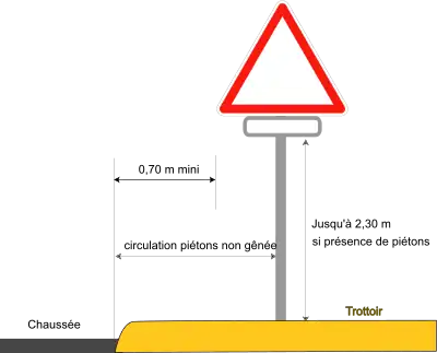 La hauteur réglementaire[8] est fixée en principe à 1 mètre (si plusieurs panneaux sont placés sur le même support, cette hauteur est celle du panneau inférieur), hauteur assurant généralement la meilleure visibilité des panneaux frappés par les feux des véhicules.