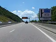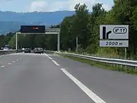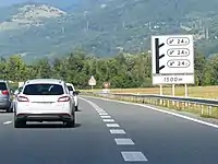 | Da51br | Sortie donnant également accès à une aire de service ou de repos, avec affectation de voie. | Blanc | Schéma simplifié de l'embranchement. La voie de sortie affectée est représentée par un trait séparé terminé en pointe de flèche et complété par le symbole d'échangeur SE2b ou SE2c et par une reproduction du signal E35a . | Distance de la sortie. | |