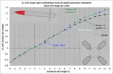 La manœuvrabilité ou le retour au neutre des fusées ou missiles peuvent être notablement augmentés en mettant en incidence propre (par rapport au fuselage) les panneaux cellulaires. Comme on le voit sur le graphe ci-contre[33], l’incidence cumulée des panneaux cellulaires (l’incidence par rapport à ) produit en effet un de même ordre de grandeur que celui produit (passivement) par la simple mise en incidence du fuselage (courbe de gauche, où les panneaux cellulaires ne sont pas mis en incidence propre)[34].