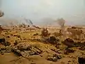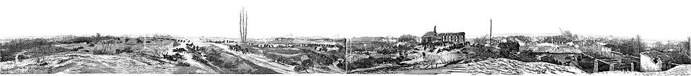 - La Défense de Paris contre les armées allemandes (1872) par Félix Philippoteaux[26] peint en collaboration notamment avec son fils Paul Philippoteaux, exposé de 1872 à 1890 au panorama National des Champs-Élysées[27] (1856, Davioud architecte, actuel théâtre du Rond-point).