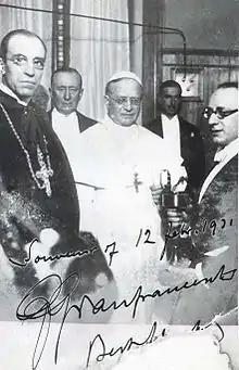 Après les accords du Latran qui résolvent la question romaine et créent l'État de la Cité du Vatican[H 36], le pape prend soin de le doter de tous les attributs de la souveraineté, bientôt reconnue par les nations — drapeau, monnaie, police, justice, banque, gare, télécommunications… —, ainsi que d'une constitution qui instaure à la fois un état de droit et une monarchie absolue, dirigée par le souverain pontife[H 37]. Critiquant le régime nazi dans la lettre encyclique Mit brennender Sorge[H 38] et condamnant le totalitarisme communiste avec Divini Redemptoris, Pie XI ordonne aux universités catholiques d'organiser un enseignement contre l'antisémitisme et le racisme mais la mort l'empêche de publier une encyclique qu'il prépare à ce sujet[H 39].