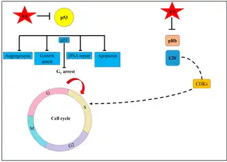 L'activation de p53 active normalement l'inhibiteur de kinase dépendant de la cycline (p21) pour forcer les cellules à rester à l'arrêt G1[31]. Cependant, lors de l'infection par le VPH, l'E6 dégrade p53, ce qui fait entrer les cellules dans la phase S du cycle cellulaire[31]. Simultanément, l'oncoprotéine E7 se lie à la protéine du rétinoblastome (pRb). La liaison de E7 à pRb lui fait libérer E2F, un facteur de transcription qui active la kinase dépendante de la cycline (CDK). Cela entraîne une perte de contrôle du cycle cellulaire, permettant aux cellules de rentrer dans la phase S (réplication) du cycle cellulaire. Les cellules infectées se différencient et prolifèrent entraînant un risque élevé d'apparition de cellules dysplasiques[31].