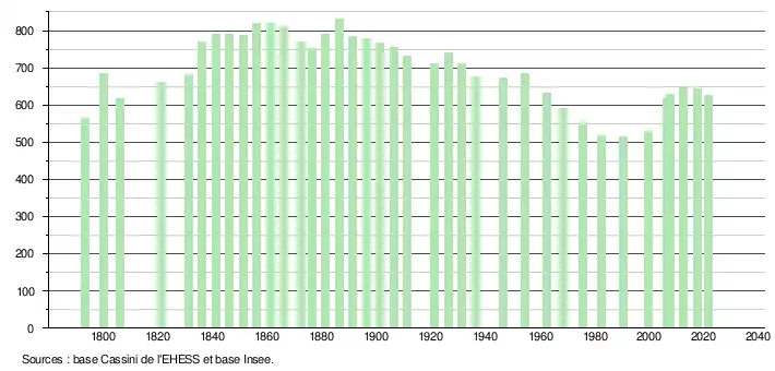 L'évolution du nombre d'habitants est connue à travers les recensements de la population effectués dans la commune depuis 1793. Pour les communes de moins de 10 000 habitants, une enquête de recensement portant sur toute la population est réalisée tous les cinq ans, les populations légales des années intermédiaires étant quant à elles estimées par interpolation ou extrapolation[28]. Pour la commune, le premier recensement exhaustif entrant dans le cadre du nouveau dispositif a été réalisé en 2007[29].