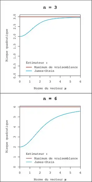 Le mot meilleur ici est à prendre au sens du risque quadratique. Le risque quadratique d'un estimateur est défini par : (ce risque correspond à une erreur quadratique moyenne multiparamétrique). L'estimateur de James-Stein est meilleur au sens qu'il a un plus faible risque quadratique que l'estimateur du maximum de vraisemblance, et ce quel que soit . On dit que l'estimateur de James-Stein domine l'estimateur du maximum de vraisemblance. Cette domination est stricte car il existe des valeurs de pour lesquelles le risque de l'estimateur de James-Stein est strictement plus petit que celui de l'estimateur du maximum de vraisemblance.
