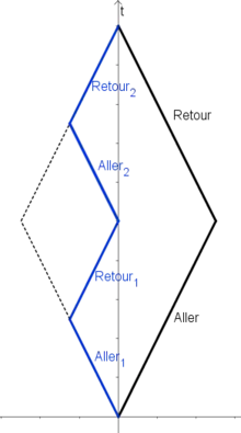 En relativité restreinte, calculer le temps propre d'un observateur entre deux événements revient à la mesure d'une longueur d'arc de la ligne d'univers parcourue par cet observateur entre ces deux événements[25]. Cette « longueur » n'est pas à prendre au sens habituel euclidien mais au sens de la pseudo-métrique de géométrie de Minkowski à quatre dimensions incluant le temps : c'est , l'intervalle d'espace-temps entre ces deux événements, défini par l'égalité . En abordant le problème sous cet angle, calculer le vieillissement différentiel des jumeaux revient à calculer la longueur des « chemins » parcourus par chacun d'entre eux dans l'espace de Minkowski[25].