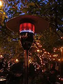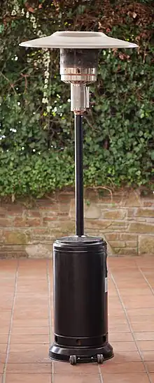 On le rencontre sous le même nom[10] ou sous le nom "chauffe-terrasse" ou "tour chauffante"[11]. Il s'agit d'un poêle radiant, généralement en acier peint et équipé d'un réflecteur en aluminium. Sa structure diffuse la chaleur produite par le gaz tiré du GPL dans un tube de verre sous la forme d'une flamme verticale. Il est équipé d'un système de sécurité, prêt à s'éteindre en cas de renversement et d'un capteur de réglage de la flamme. Il peut être également alimenté par des pellets. On le rencontre également de manière privilégiée en terrasse des bars et restaurants. Il peut être équipé d'un dispositif empêchant toute fumée de s'en échapper au sommet.